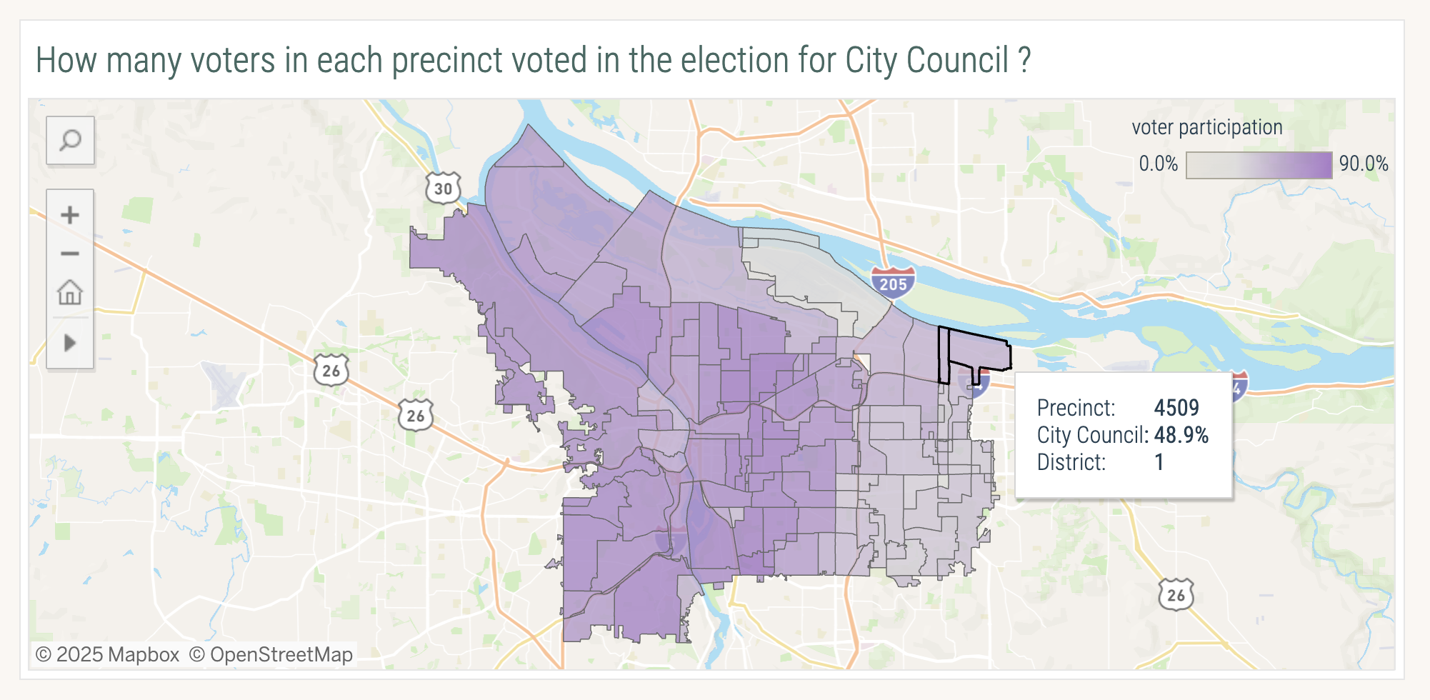 Dig into maps depicting voter participation in local elections and Portlander demographics. How might these maps help us think about effective voter education strategies?